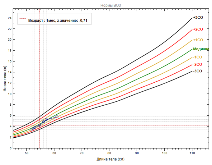 Длина тела — 54,7 см (Z-score длина к возрасту−0,1 SD, ВОЗ, 2009) – норма (рис.1)