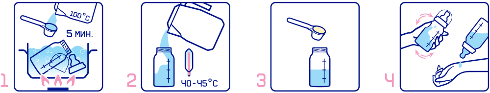 1. Вымойте руки и простерилизуйте бутылочку, соску и крышку. Обязательно используйте прилагаемую мерную ложку. Перед использованием обработайте ее кипящей водой и высушите.